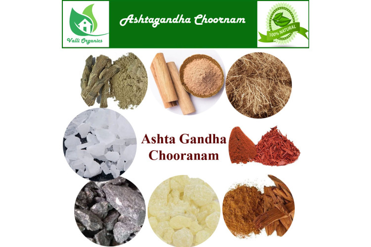 Ashta Gandha Chooranam is a powder containing eight herbal and pooja ingredients such as Vasambu, Sandalwood, Red Sandalwood, Vettiver, Green Camphor, Sambrani, White Kungiliyam, Devadaru. These items dried well and ground into very fine powder.