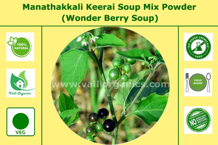 One teaspoon of Manathakkali Soup Mix Powder can be added with 200ml of boiled water to make a very good, nutrition rich Manathakkali Soup. This is 100% natural and no other colouring agents, chemicals, preservatives added.